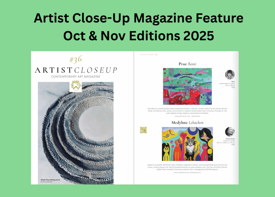 I was very excited to be selected to be a featured Artist in this wonderful global Art Magazine called “Artist Close-Up”, in both the October & November Editions. This was a lovely honour & surprise to be included. Please check out this beautiful Magazine here: https://www.artistcloseup.com/magazine